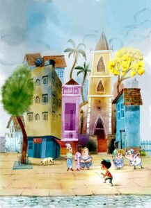 Eu gosto também do prédio e do que ele representa para o cenário de Bom Despacho. Fiz tanta questão de valorizá-lo que pedi ao Carlos Carminha, ilustrador do meu livro infantil, Pinoquiabo, que o incluísse na primeira aquarela do livro, acrescentando ao enredo um toque das minhas memórias pessoais, guardadas nas sombras da minha infância. Aquarela por Carlos Caminha. (iBOM / Vander André).