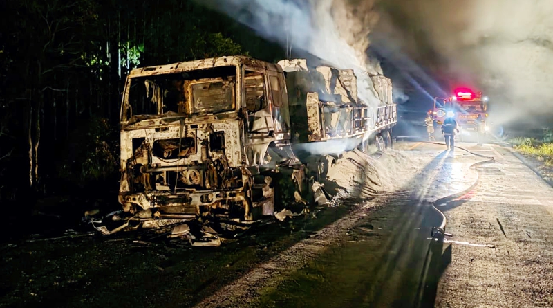 Ler maisFoto começou após a carreta bater em peça que se desprendeu de caminhão que seguia na frente. Bombeiros foram